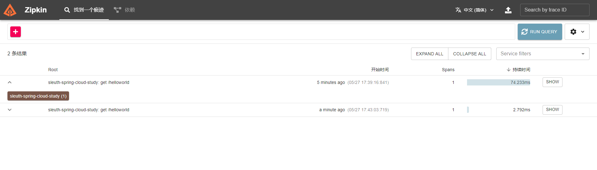 - 启动微服务应用并调用接口,可以看到zipkin控制台会显示出服务调用链信息。