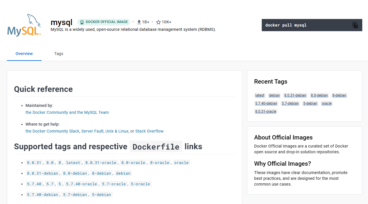 - 在mysql - Official Image | Docker Hub找到需要Mysql镜像。