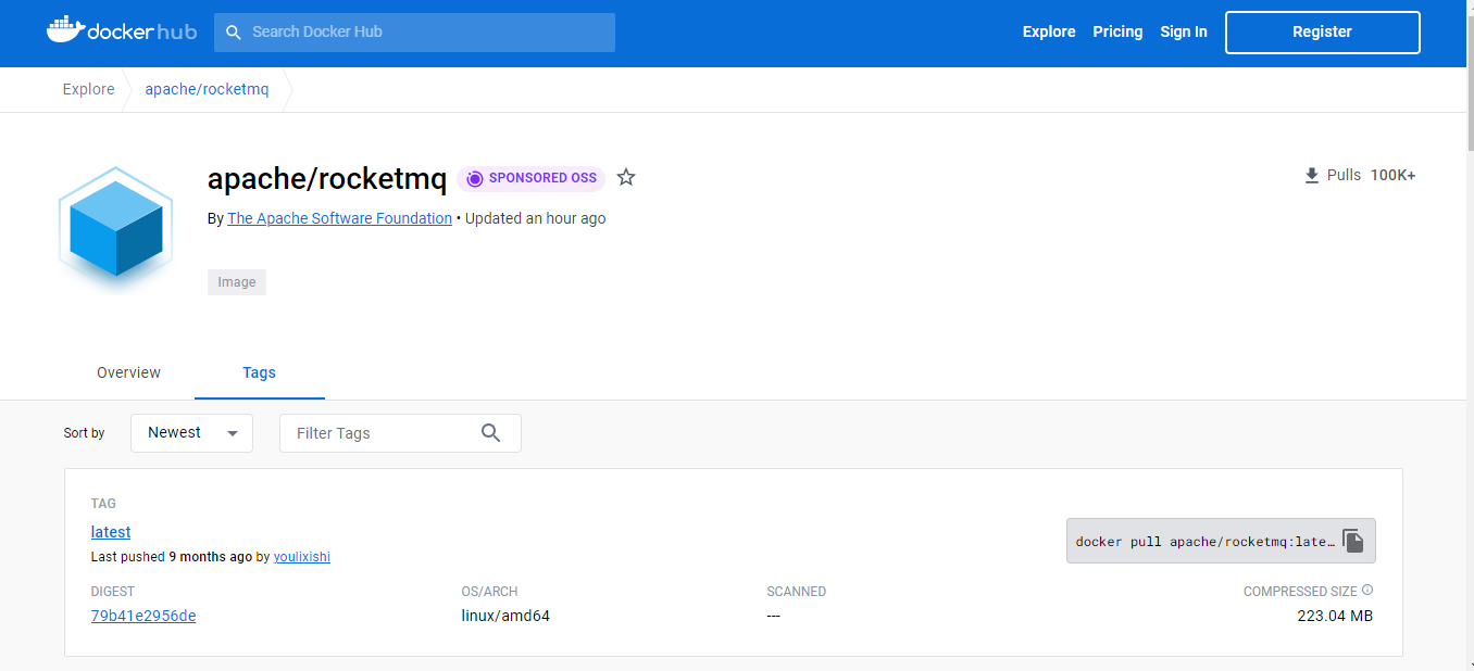 - 在https://hub.docker.com/r/apache/rocketmq上找到需要的RocketMQ版本的镜像。