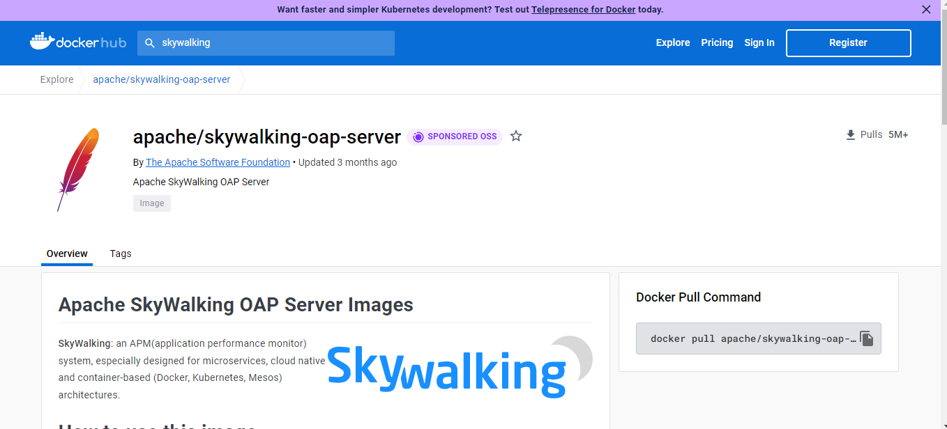 - 在https://hub.docker.com/r/apache/skywalking-oap-server找到需要SkyWalking-oap-server镜像。