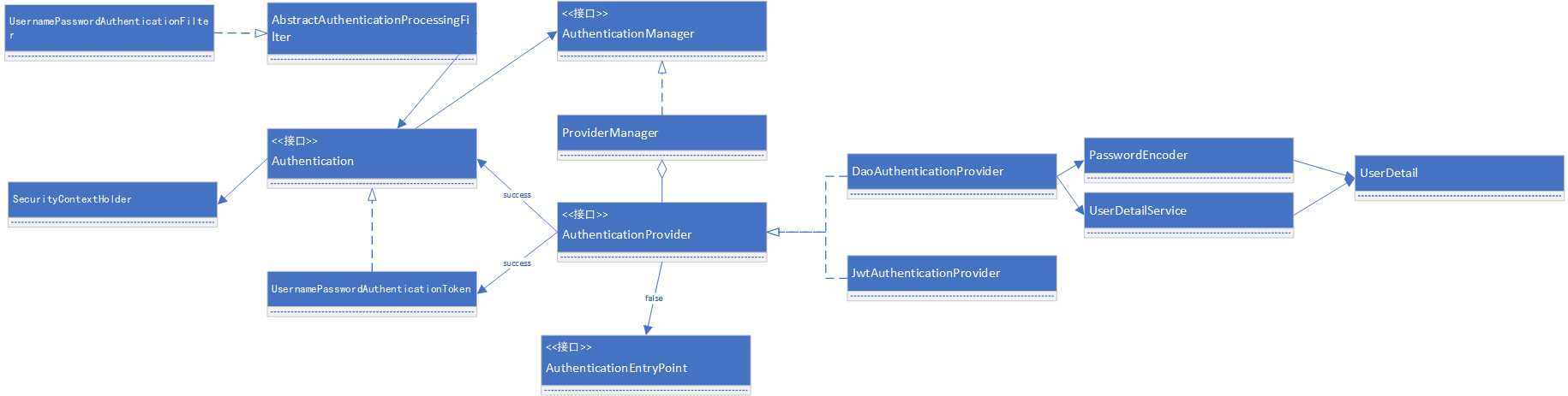 - AuthenticationProvider再调用UserDetailService获取用户信息、验证用户密码,认证成功后,返回一个已认证的Token或抛出认证失败的异常。