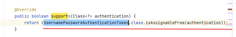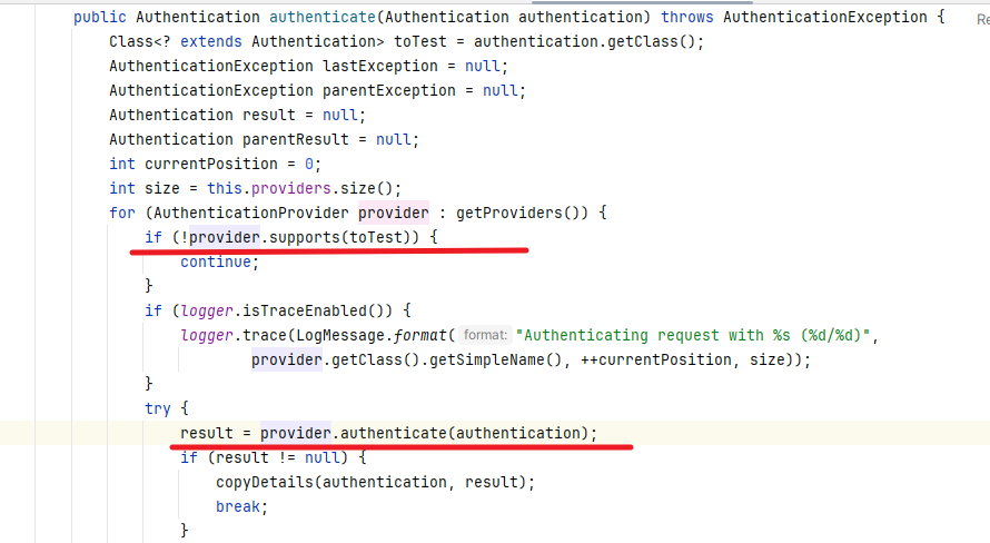 - ProviderManager可以包含多个AuthenticationProvider,使用AuthenticationProvider对请求认证前,先执行suppoerts()方法,判断是否支持验证,若支持再执行具体的认证过程authenticate()