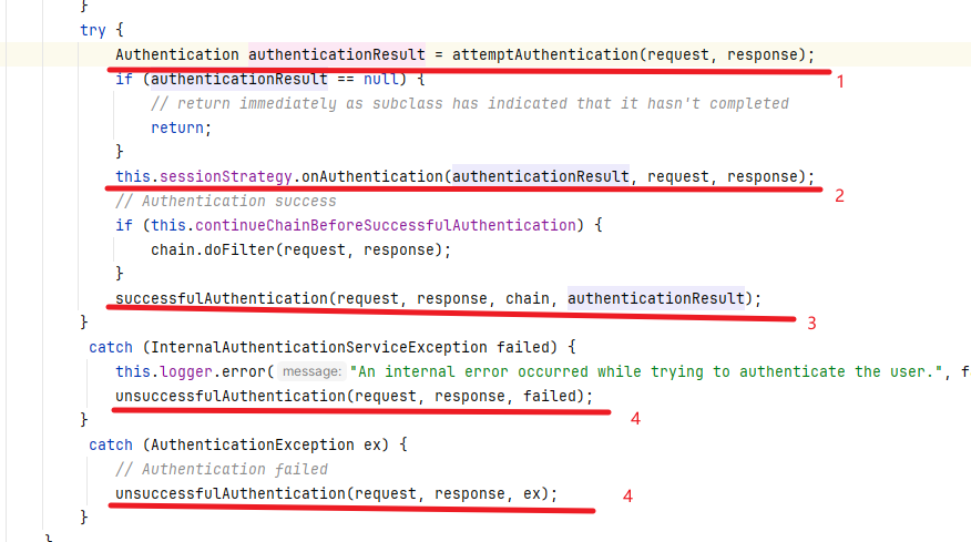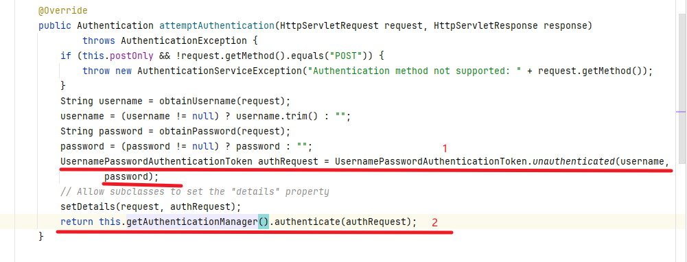 - 之后过滤器会调用attemptAuthentication()方法执行具体的认证逻辑,该方法为抽象方法,需要在子类内执行。