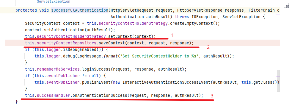 this.securityContextHolderStrategy.setContext(context);将安全上下文保存到SecurityContextHolder中this.securityContextRepository.saveContext(context, request, response);将安全上下文与请求或会话绑定this.successHandler.onAuthenticationSuccess(request, response, authResult);执行AuthenticationSuccessHandler的逻辑,一般为重定向到某个端点。